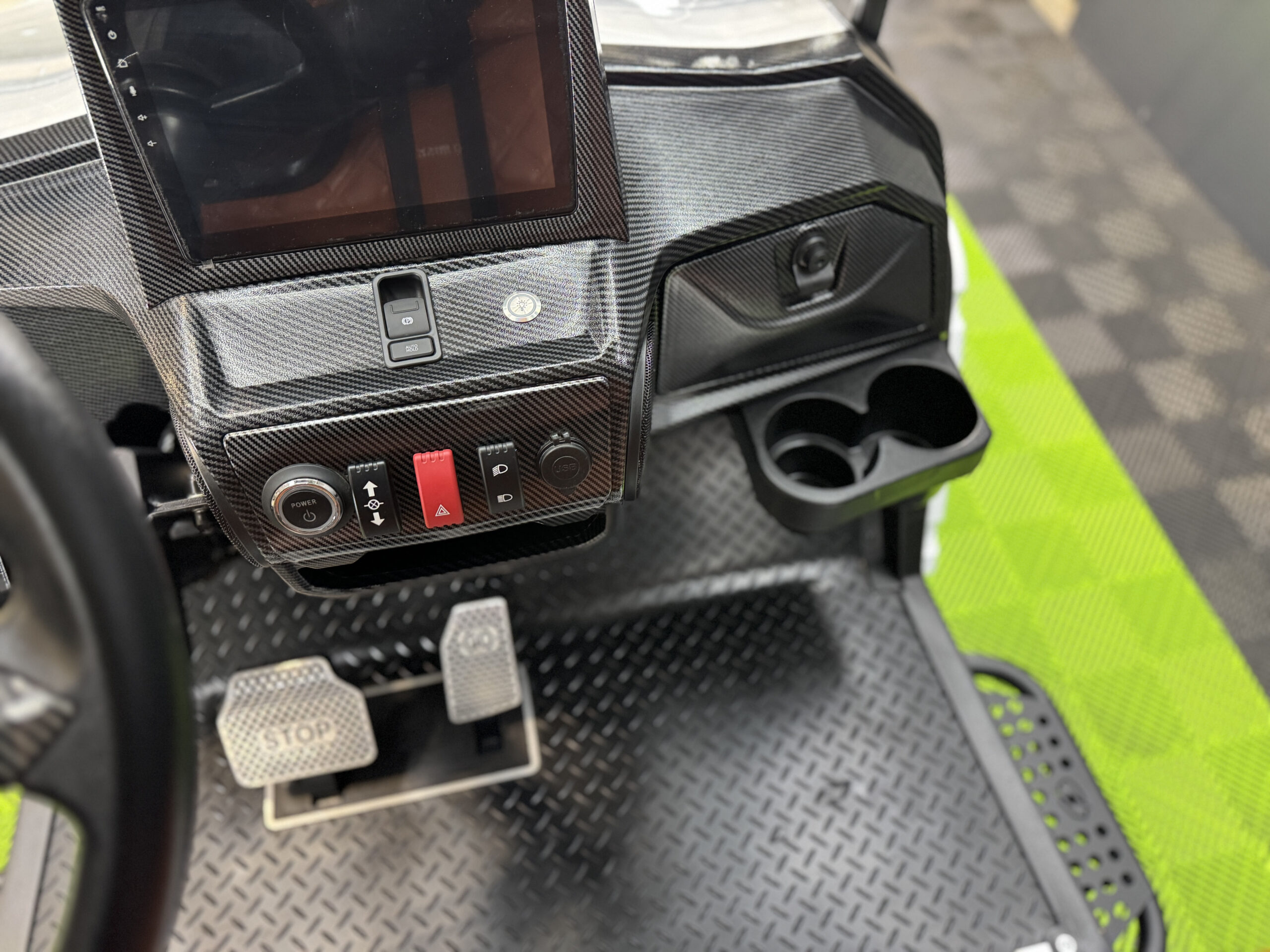 - New custom carbon fiber look dashboard with 2 locking compartments and 4 cup holders