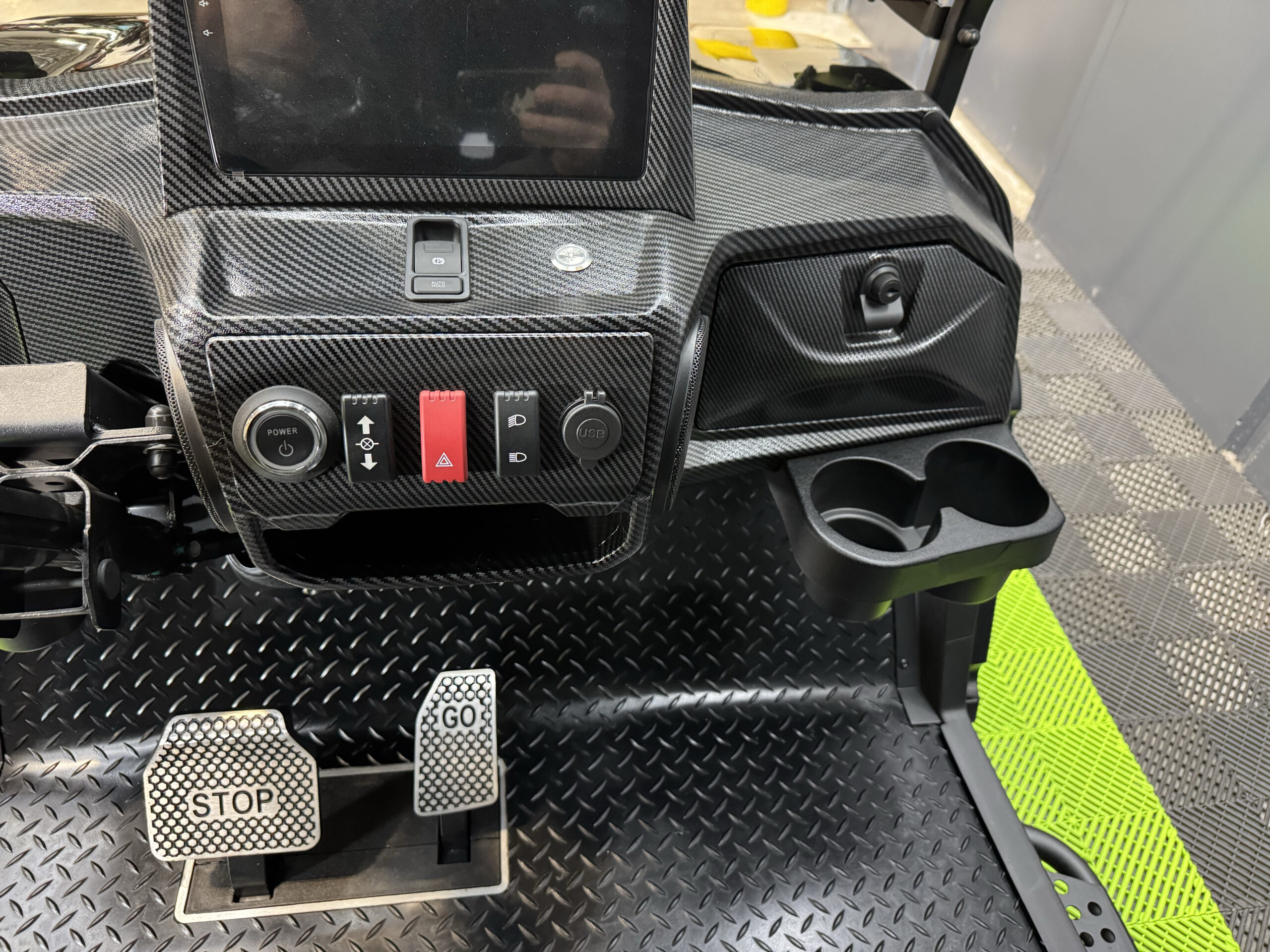 • New custom carbon fiber look dashboard with 2 locking compartments and 4 cup holders