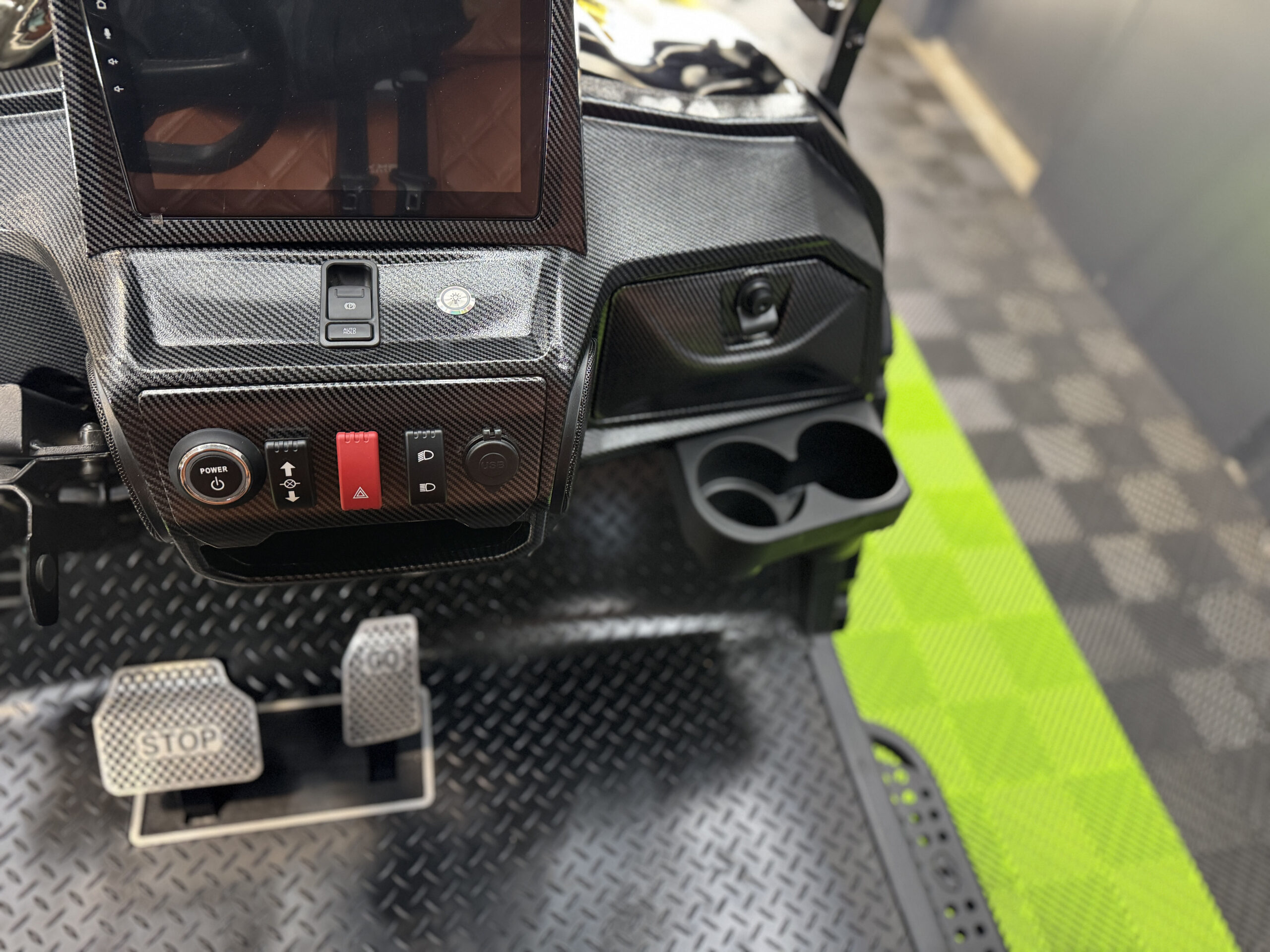 - New custom carbon fiber look dashboard with 2 locking compartments and 4 cup holders
