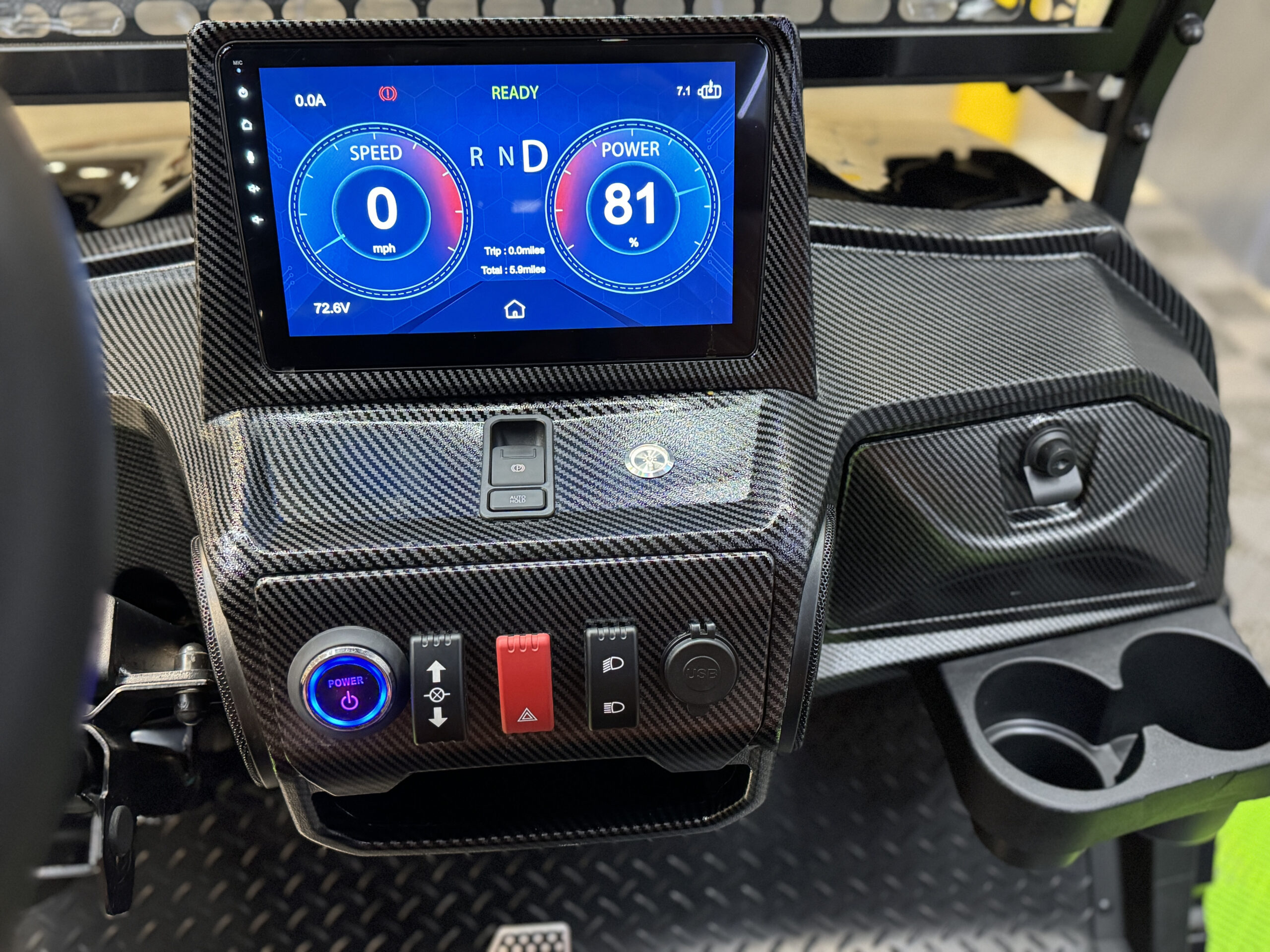 • New custom carbon fiber look dashboard with 2 locking compartments and 4 cup holders
